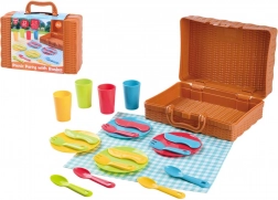 Élvezd a játékos lakomát bárhol ezzel a színes szettel a praktikus kosárban. Tartalmaz mindent, ami négy fő megterítéséhez kell – tányérokat, poharakat és evőeszközöket – valamint egy takarót. Könnyű és biztonságos kivitel, ideális 2 éves kortól, és remekül fejleszti a fantáziát és a társas játékot otthon, a kertben és a szabadban is.