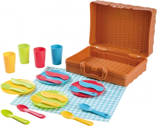 Ez a gyerek piknikkészlet kosárral mindent megad a kis szakácsoknak a tökéletes piknikhez. A strapabíró műanyag kosárban tányérokat, poharakat és evőeszközkészleteket találsz négy személyre, továbbá egy stílusos, kockás mintájú takarót. A szett könnyű, könnyen tisztítható műanyagból készült, így ideális a mindennapi játékhoz.