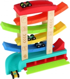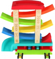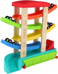 Ez a kaszkádos versenypálya masszív fa oszlopokat és strapabíró műanyag rámpákat kombinál élénk színekben, amelyek serkentik a gyermeki kíváncsiságot és a vizuális érzékelést. A gyerekek fejlesztik finommotorikájukat, kéz–szem koordinációjukat, valamint a ok–okozati összefüggések megértését, miközben figyelik a kisautók útját.