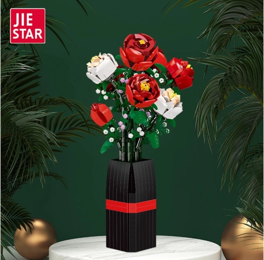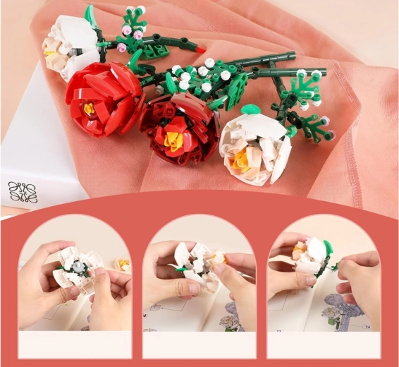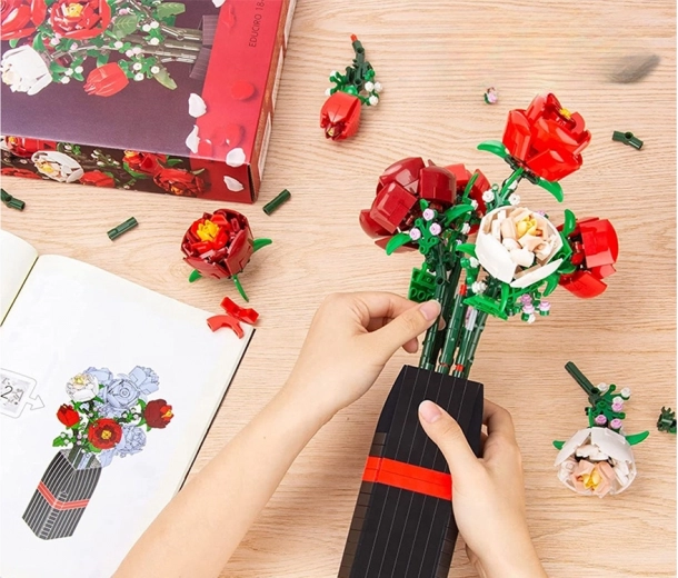 Építőkészlet vázában álló rózsacsokorral, 818 darab. Élethű formák, élénk színek, kb. 36 cm magasság, egyszerű útmutató. Remek ajándék 6 éves kortól.