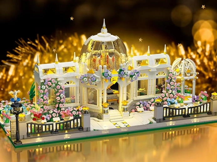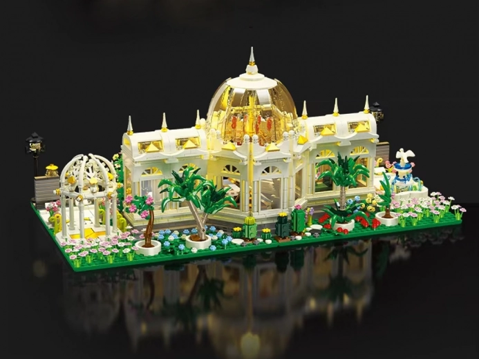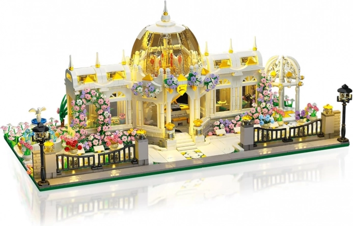 Neoklasszicista botanikus pavilon építőkészlet 2397 darabbal és LED világítással. Átlátszó kupola, oszlopok, buja növényzet és részletek a lélegzetelállító modellhez.