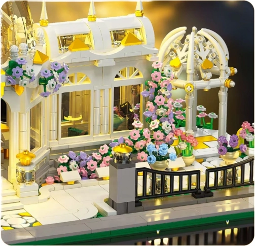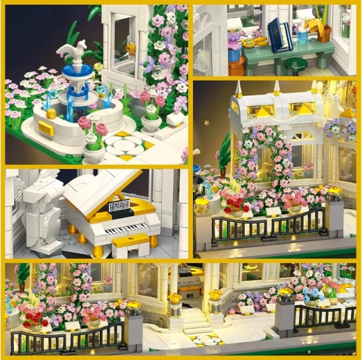 A modell a gyakorlott építőknek is örömet szerez: elegáns oszlopok és balusztrádok aranyszínű akcentusokkal, élethű sétányok, nyitható ajtók és számos kiegészítő – az asztalkától könyvvel és ollóval a fortepianóig, valamint apró dekorációkig. Az esti hangulatot a LED világítás teszi teljessé, amely beragyogja a kupolát és az ablakokat, így télikert hatást kelt.