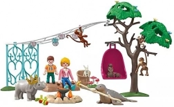 A legkedveltebb hely a forgó függőszék, a tűzrakóhely körül kényelmes ülőhelyek várnak, az ágról pedig egy banán lóg, ideális a sütögetéshez. A puha születésnapi korona kiválóan megosztható a gyerekek és az állatkák között, és ünnepi hangulatot kölcsönöz az egész jelenetnek.