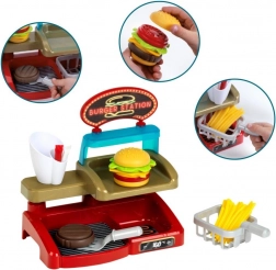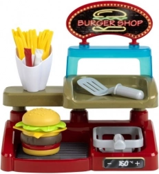 A Burger shop szett gondosan megtervezett konyhai készlet kis szakácsok számára, amely autentikus élményt nyújt a kedvelt gyors finomságok elkészítéséből. A gyerekek tetszés szerint kombinálhatják az egyes részeket, és pontosan ízlésük szerint állíthatják össze a burgert, kiegészíthetik hasábburgonyával, és választhatnak ketchupot vagy majonézt – akárcsak egy igazi konyhában.
