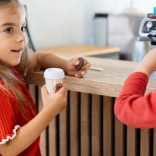 Két pohár tetővel, portafilter, tamper, három kapszula és cukorcsomagok – minden, amire a kis baristáknak szükségük van az eszpresszó felszolgálásához.