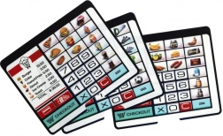 Három tematikus kártya alakítja a pénztár környezetét önkiszolgálóvá, étteremmé vagy klasszikus bolttá. A gyerekek kiválasztják, milyen történetet játszanak.