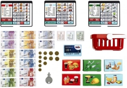 Bevásárlókosár, játék bankkártya, papírpénz és érmék, termék-/kódkártyák