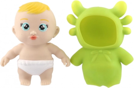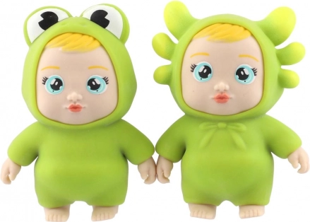 Antistressz szilikon szorongató játék – kisbaba állatjelmezben, 14 cm. Rugalmas szilikon, nyugtató hatás, a finommotorika támogatása. 3 éves kortól.