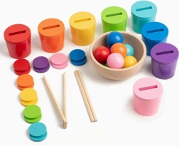 Szórakoztató Montessori készlet FSC-tanúsított fából, színek szerinti válogatáshoz és a finommotorika fejlesztéséhez. A gyerekek kanállal, csipesszel vagy pálcikával áthelyezik a golyókat és érméket a pohárkákba, miközben kéz–szem koordinációt és koncentrációt gyakorolnak. 8 élénk színt, tálat és érmékhez való lyukas fedőket tartalmaz. Fejleszti az érzékelést, a finommotorikát és a játékos tanulást.