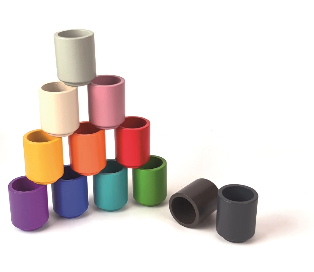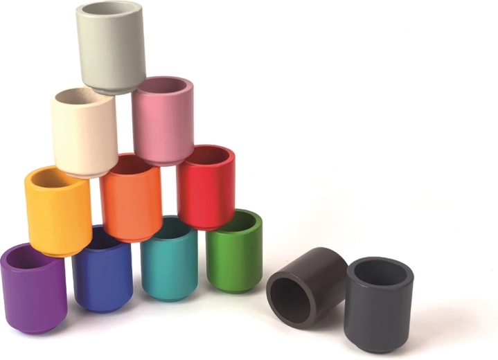 A 12 szivárványszínű elemből álló készlet támogatja a színek felismerését és párosítását, a matematikát megelőző készségeket és a koncentrációt.