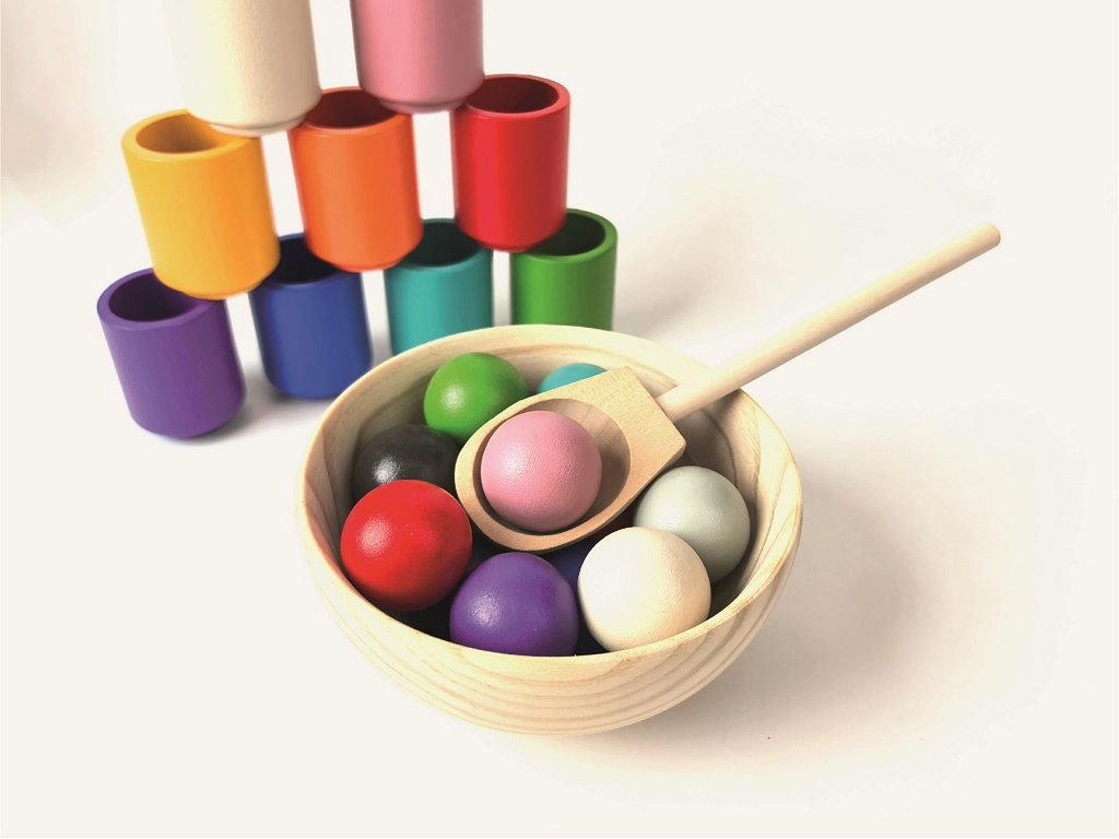 A készlet tálat, kanalat, golyókat és csészéket tartalmaz 12 szivárványszínben. A FSC fából készült minőségi kivitelezésnek köszönhetően a játék tartós, biztonságos és kellemes tapintású. Kiváló otthoni használatra és óvodákba is.