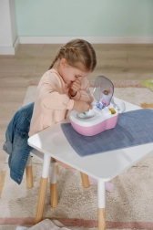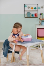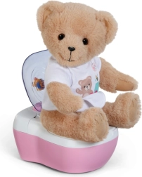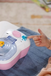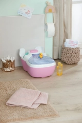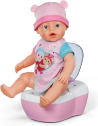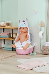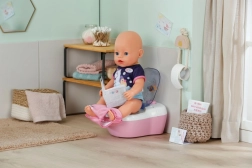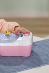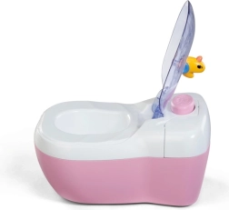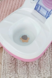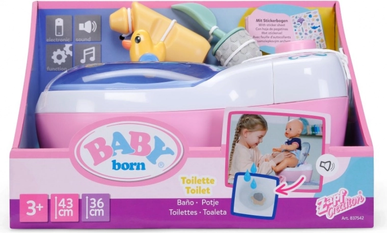 A BABY born interaktív WC a mindennapi babaápolást vidám rituálévá varázsolja. Amint a baba ráül az ülőkére, valósághű csobbanó hangok hallatszanak, ha pedig tovább marad, tréfás dallam indul, majd öblítéshang követi. Mindez játékosan motiválja a gyerekeket a higiénés szokások gyakorlására.
