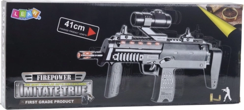 41 cm-es fekete gyerek géppisztoly fény- és hangeffektekkel és irányzékkal. Tartós műanyag, ajándékcsomagolás. Remek ajándék akciójátékokhoz.