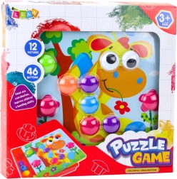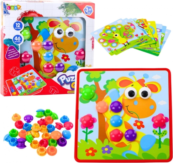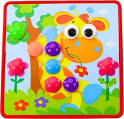Ez a kreatív mozaik ötvözi a tanulást és a játékot: a gyerekek a sablonok vagy saját fantáziájuk alapján helyezik a színes gombokat a nyílásokba, így fejlesztve a logikus gondolkodást és a türelmet. A változatos színpaletta és a kedves motívumok miatt szívesen visszatérnek a játékhoz – a rendrakás pedig egyszerű a praktikus rendszerezőnek köszönhetően.