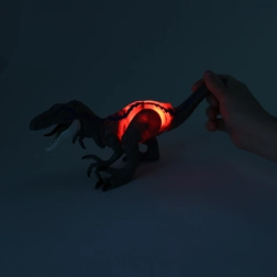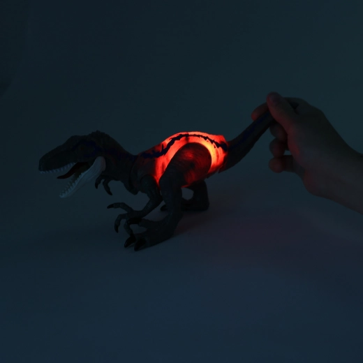 Ez a részletesen kidolgozott Velociraptor dinoszaurusz hiteles őskori élményt nyújt a gyerekeknek. A farok megnyomására félelmetes üvöltés hallatszik, és bekapcsol a fényhatás, amely fokozza a játék drámai hangulatát. A fej megnyomásával kinyílik az állkapocs és megmozdulnak az elülső végtagok, így az akció sosem ér véget.