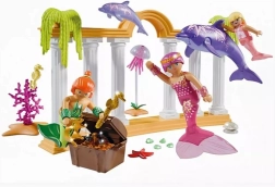 Fedezze fel a varázslatos víz alatti világot egy sellőcsaláddal, amely az elsüllyedt város titokzatos kincsét keresi. A szettben játékos delfin a kicsinyével és egy láda tele arannyal, drágakövekkel és kiegészítőkkel – köztük egy valódi gyűrűvel. A készlet gazdag részleteket kínál, mint például korallzátonyok, tengeri növények és bájos élőlények, ideális a kreatív játékhoz.