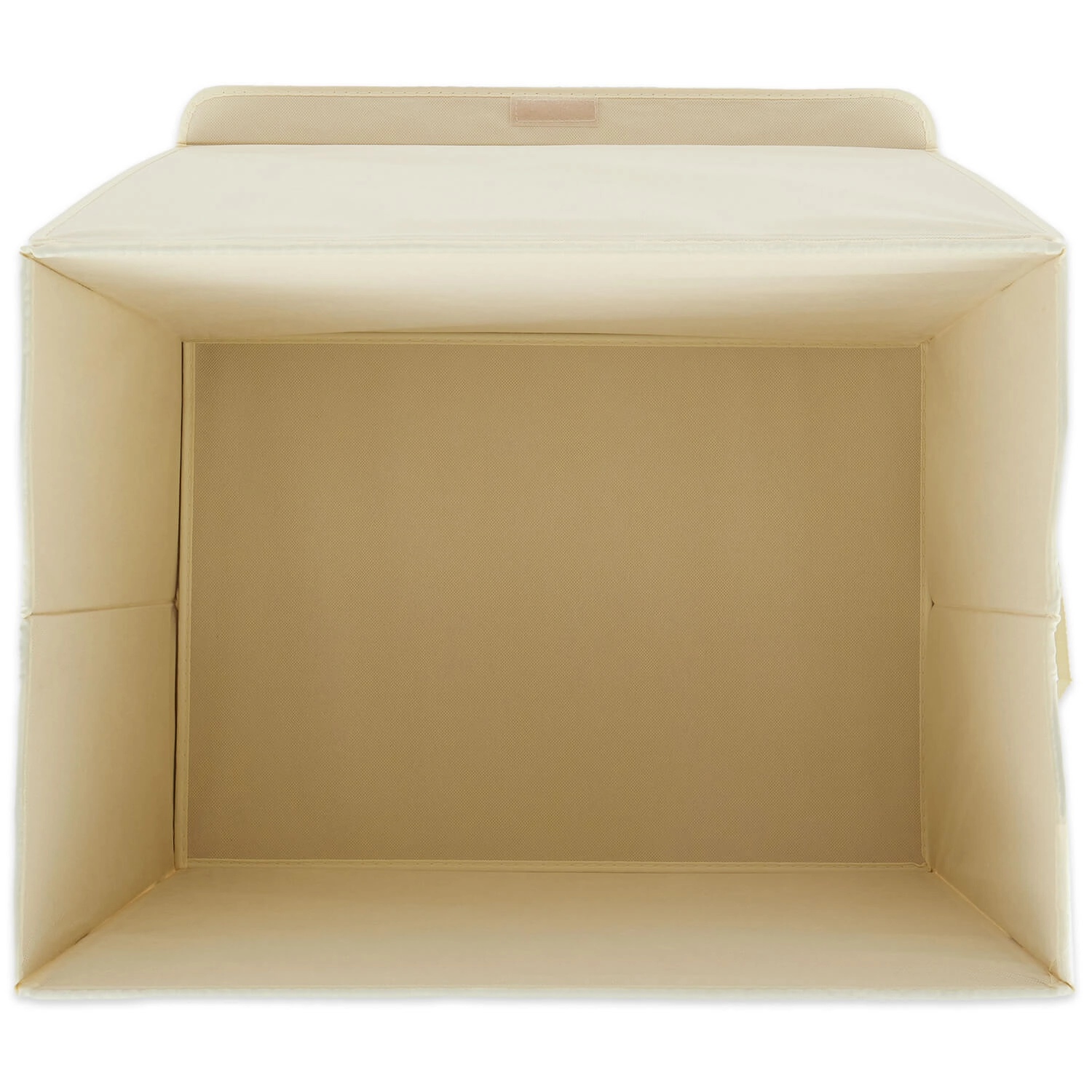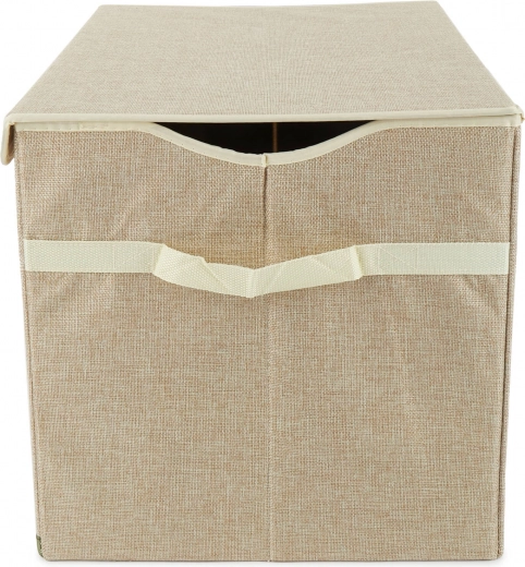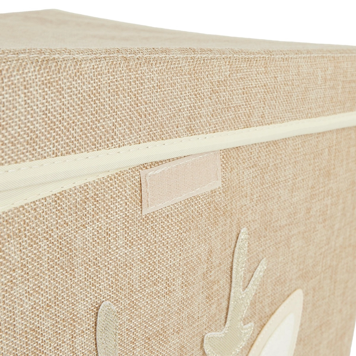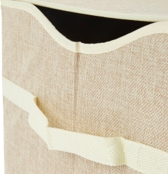 Az oldalsó fogantyúknak köszönhetően a doboz könnyen kezelhető, és amikor épp nincs rá szükség, egyszerűen összehajtható és a szekrényben tárolható. A lenhatású külső anyag elegáns megjelenést kölcsönöz, és illik a legtöbb gyerekszobai enteriőrhöz.