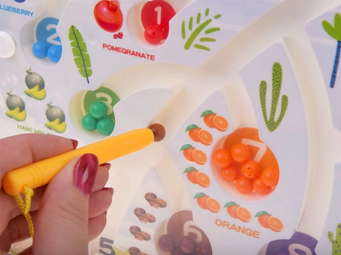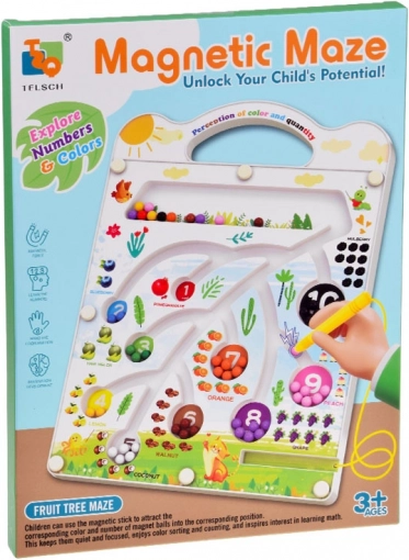 Az interaktív, labirintussal ellátott mágneses tábla játékos formában támogatja a készségek fejlesztését. A gyermek a mágneses toll segítségével a golyókat a megfelelő nyílásokba irányítja, miközben gyakorolja a színek felismerését, a számolást 10-ig és a válogatást. Minden golyó átlátszó fedél alatt van, így semmi sem vész el, és a játék biztonságos a kisebbek számára is.