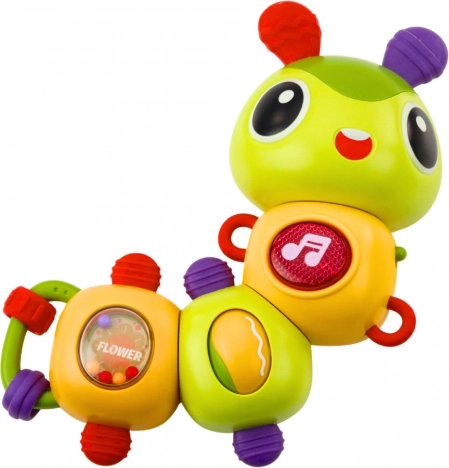 Interaktív szenzoros hernyó – zenélő csörgő és rágóka 360°-ban forgatható elemekkel