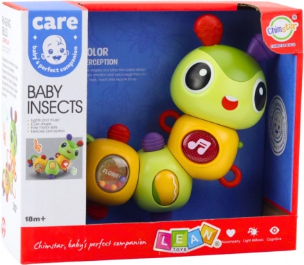 Interaktív szenzoros hernyó 18 hónapos kortól: LED fények, dallamok, 360°-ban forgatható elemek, gyöngyök, csörgő és rágóka. Érzékek és motorika fejlesztése.