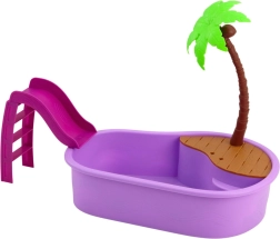 • Nyári készlet kreatív játékhoz: medence, csúszda, pálma és tematikus tartozékok.