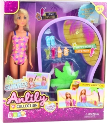 Fedezd fel a nyári játék varázsát a ANLILY babával fürdőruhában, csúszdás medencével és pálmával. A gazdag kiegészítő-készlet (szandálkák, italok, fagylalt) támogatja a kreatív játékot, fejleszti a fantáziát és órákig tartó szórakozást nyújt.