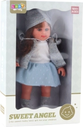A bájos SWEET ANGEL baba 36,5 cm magas, elegáns szürke szettben (ruhácska, kardigán, sapka és cipőcskék), amely örömet szerez minden gyermeknek. Puha, kellemes tapintású, és a legkisebbeknek készült – segíti a képzelőerő, az érzelmek és a szerepjáték fejlődését a családos játék során.