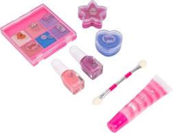 - Komplett felszerelés: matt szemhéjpúderek, csillámok, rúzs, körömlakk, ecsetek és kiegészítő.