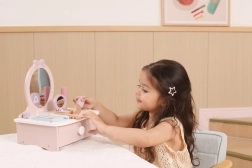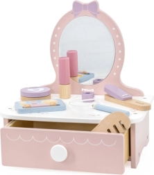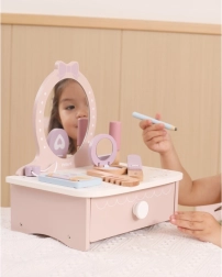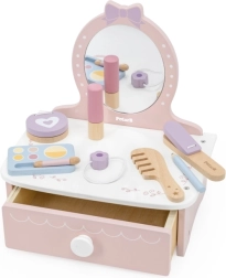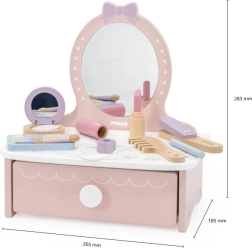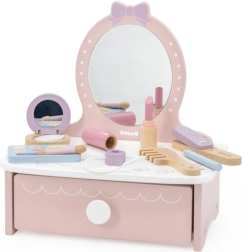 Stílusos, fából készült gyerek pipereasztal, amely órákon át tartó kreatív szórakozást nyújt. Tartalmaz asztalkát és biztonságos fa kiegészítőket, mint fésű, hajsütővas és smink. Ideális 3 éves kortól. Tartós fa kivitel, gazdag tartozékok és kompakt méretek a gyerekszobában való könnyű elhelyezéshez.