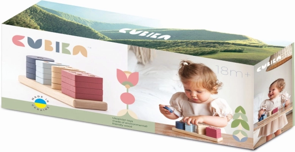 A Cubika Pastel V alakú formaválogató fa kirakó játékos módon segíti a tanulást. A gyerekek a 16 perforált geometriai formát a téglalap alakú alap tüskéire rendezik és fűzik, miközben fejlesztik a szem–kéz koordinációt, valamint megtanulják felismerni a színeket és formákat.