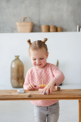 A csirkés, pasztell színű piramis minőségi fa kirakó, amely játékos módon tanítja a gyerekeket a helyes méret- és színsorrend szerinti építésre. A 8 precízen megmunkált elem révén fejlődik a finommotorika, a türelem, valamint az alak- és színérzékelés.