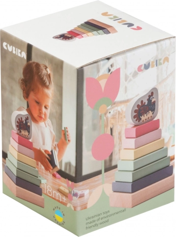 A bájos, pasztell színű Cubika fa kirakó 8 elemből áll, amelyekből elegáns csirkés piramis rakható össze. Támogatja a szenzomotorikát, a logikus gondolkodást és a kreativitást, fenntartható forrásból származó fából készül, és biztonságos, vízbázisú festékekkel van színezve. Megfelel az EN 71 szabványnak és rendelkezik TÜV tanúsítvánnyal. 18 hónapos kortól ajánlott. Európában készült.