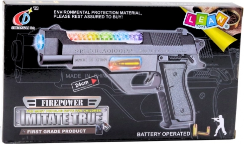 A szórakoztató, elemes játékpisztoly órákon át tartó akciódús élményt nyújt a gyerekeknek. A ravasz megnyomása után felgyulladnak a színes LED fények, és valósághű lövés hangok hallatszanak. A tartós, minőségi műanyag kivitel, a mozgó elemek és a kompakt, 24 cm-es méret tökéletes kiegészítővé teszik a kreatív játékhoz és a fantázia fejlesztéséhez.
