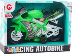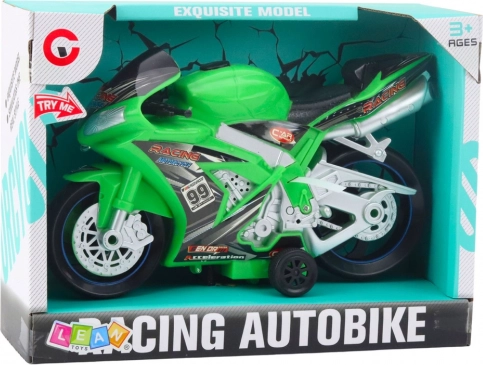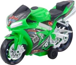 Ez a zöld versenymotor minden kis sebesség- és autó-motorsport rajongónak örömet szerez. Tartós műanyagból készült, stabil talppal és széles kerekekkel, amelyek magabiztos haladást biztosítanak különböző felületeken. A gomb megnyomására fényhatások és élethű motorhangok indulnak, fokozva a játékélményt.