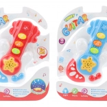 Szórakoztató műanyag gitár a legkisebb zenészeknek, amely fényhatásokat és gombnyomásra hangokat kínál. A kompakt méreteknek köszönhetően könnyen tartható a kis kezekben, és ideális a motorika és az érzékelés fejlesztésére. Tápellátását 2 db AAA elem biztosítja, amelyek a csomag részét képezik.