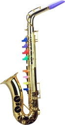 Az elegáns arany színű, színes billentyűs gyerek szaxofon első pillantásra magával ragad, és kényelmes fogást biztosít. Az elemek nélküli, mechanikus kialakítás biztonságos, környezetbarát és mindig kész a játékra – csak fújni és a billentyűket lenyomni kell.