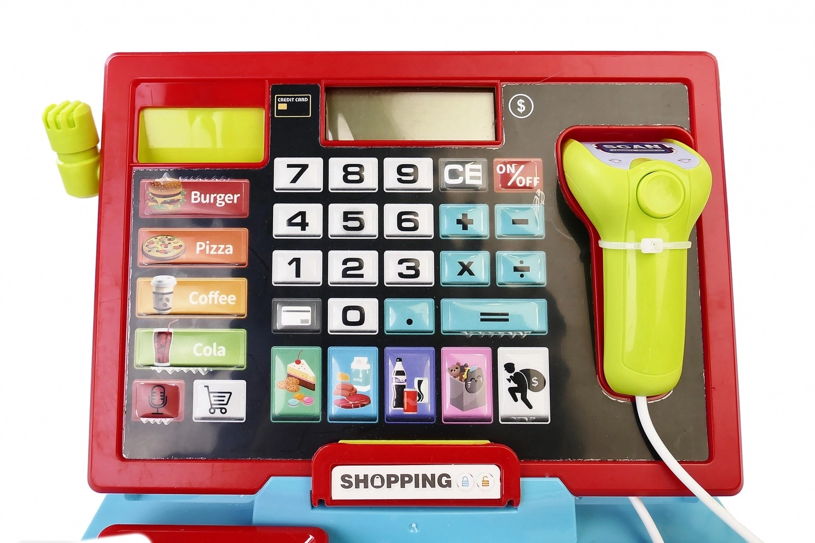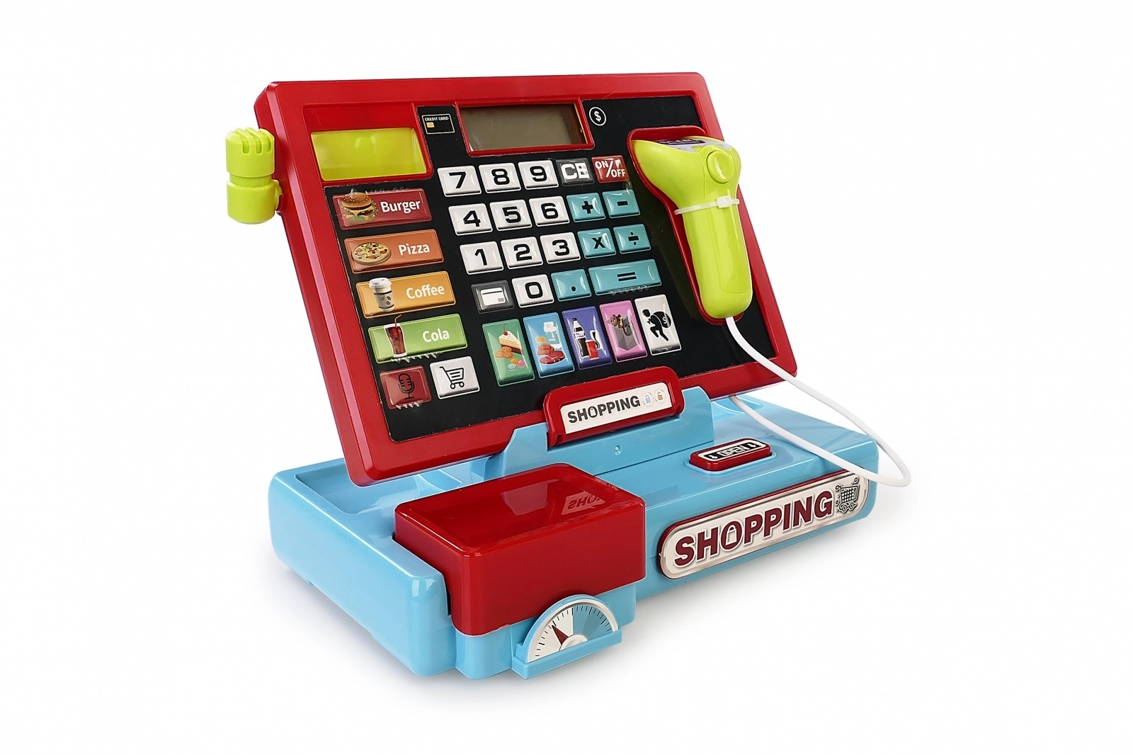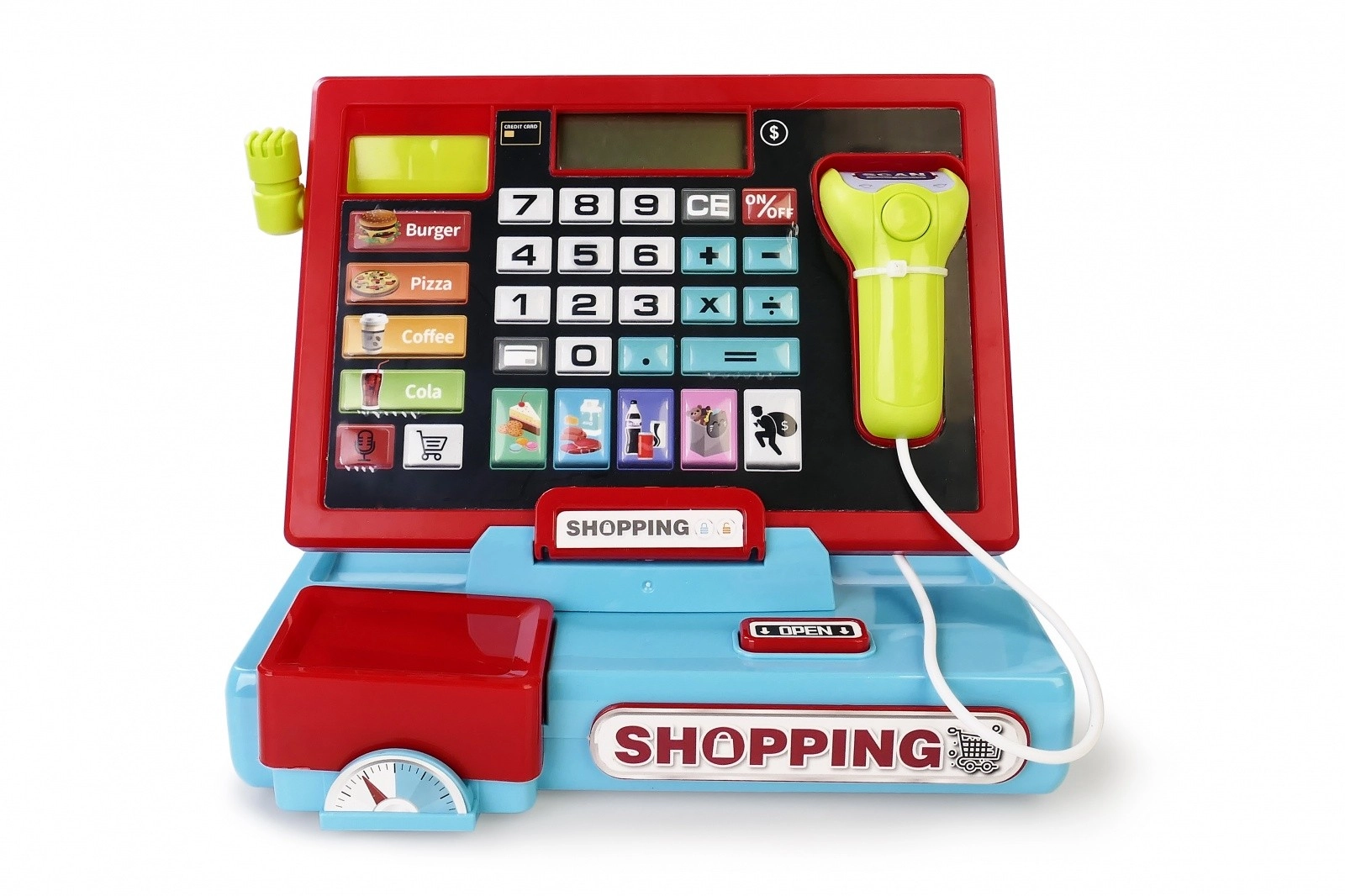 Az ikonokkal ellátott gombok megnyomásakor a kijelzőn véletlenszerű számok jelennek meg, ami növeli a szórakozást és a meglepetés élményét. A nyitható pénzfiók tovább fokozza az autentikusságot, és megtanítja a gyerekeket a gazdálkodás alapjaira.