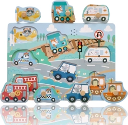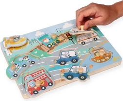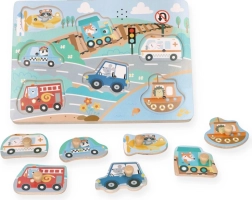 Ezek az interaktív, fa hangos puzzle-k remek választás az első ismerkedéshez a közlekedés világával. Minden darab egy másik járművet ábrázol, és a helyes helyre téve hiteles hang hallható, ami motiválja a gyerekeket az ismételt játékra és tanulásra.