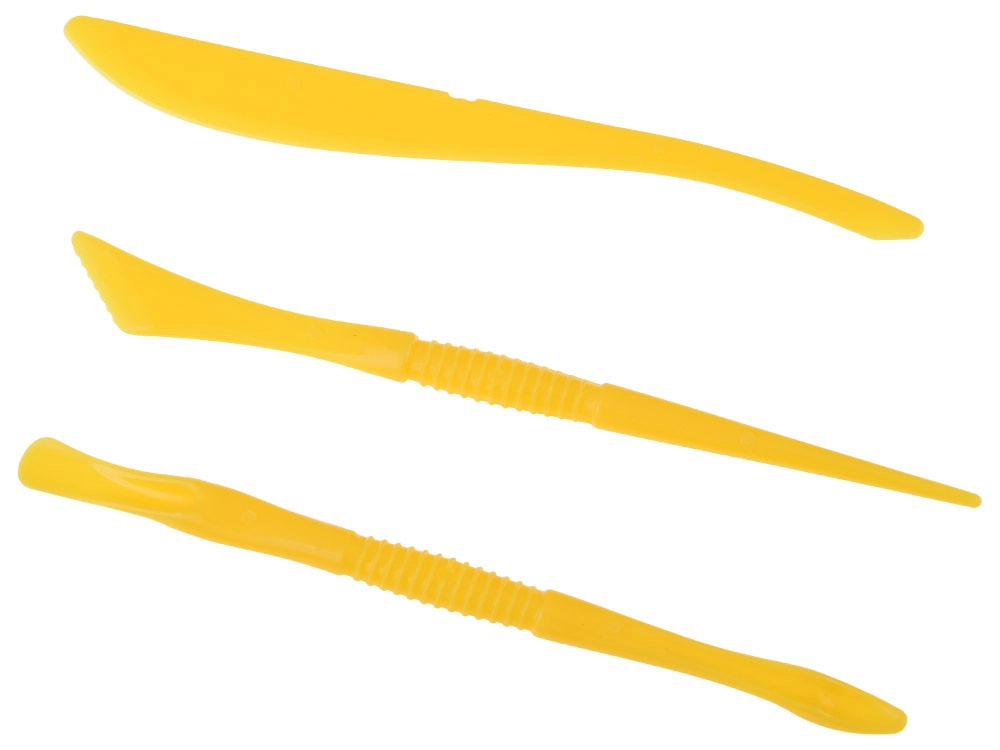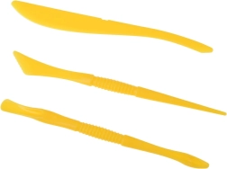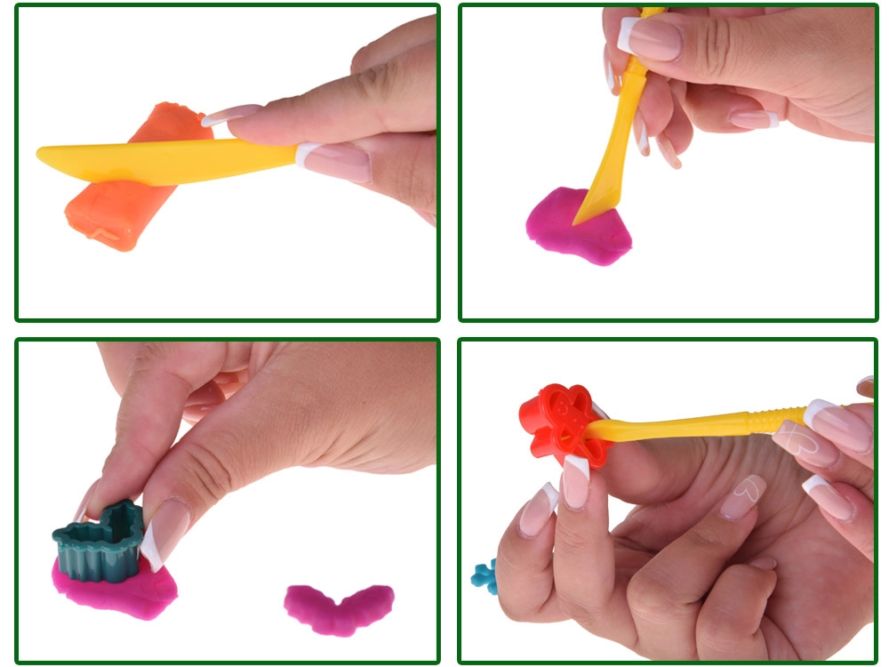 A csomag tartalmaz továbbá 3 biztonságos műanyag kést a feleslegek pontos leválasztásához és a részletek kidolgozásához. A csomagoláson hasznos színkalauz található, amely megmutatja, milyen színek jönnek létre az egyes masszák keverésével.