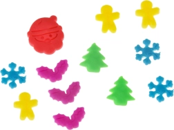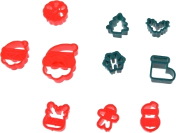 - 10 karácsonyi forma: hóember, mézeskalács figura, rénszarvas, nagy Mikulás-fej, kis Mikulás-fej, karácsonyi koszorú, hópehely, Mikuláscsizma, fenyőfa, fagyöngy