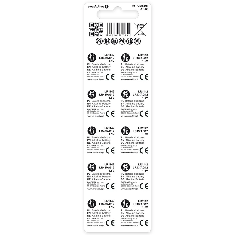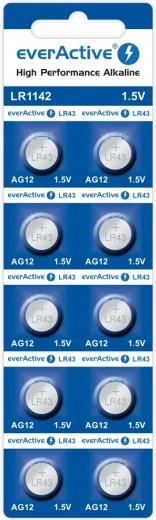 Az everActive LR43 lúgos gombelemek (más jelölések: AG12, G12, LR1142) megbízható tápellátást biztosítanak kis készülékek számára. 1,5 V állandó feszültséget és alacsony önkisülést kínálnak, ezért alkalmasak ritkábban használt eszközökhöz.