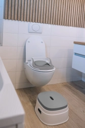 A csomag része a könnyű és gyors tisztítást szolgáló kivehető belső betét, a standard WC-hez használható levehető szűkítő, valamint a praktikus fellépő oldalsó fogantyúkkal, amelyek segítenek a gyermeknek elérni a mosdót vagy magasabb felületeket.