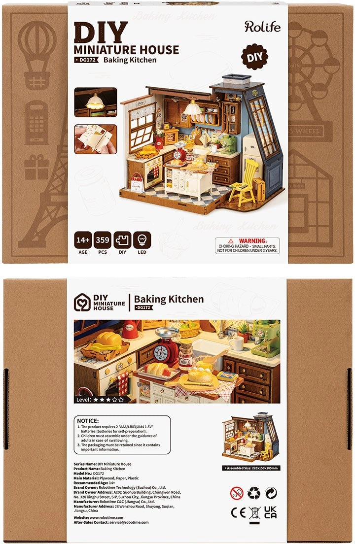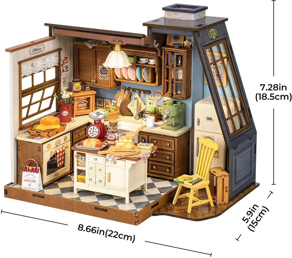 Ez a részletgazdag miniatűr házikó a régi, jóféle konyhák hangulatát hozza el. Beépített fa szekrények, régies mérleg, kávéfőző, ragyogóan fehér munkalapok és retró sárga szék található benne. A nagy ablakok – az egyik európai stílusú, ferde üvegezéssel, a másik kis tetővel és függönnyel – fényt és bájt kölcsönöznek a jelenetnek. A LED világítás tovább erősíti a meghitt, otthonos hangulatot.