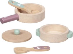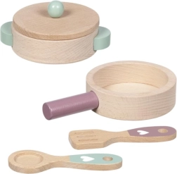 Ez a fa főzőkészlet minden kis szakácsnak örömet szerez. A serpenyő és a fedeles lábas tartós bükkfából készült, amely bírja a mindennapi „konyhai kísérleteket” is. A masszív kidolgozásnak és a sima éleknek köszönhetően a játék biztonságos és kellemes tapintású.
