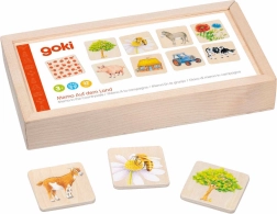 A GOKI Falusi fa memóriajáték közelebb hozza a gyerekekhez a tanya életét és környezetét. A 32 masszív lapka (16 pár) segítségével játék közben természetes módon gyakorolják a memóriát, a figyelemösszpontosítást és a képek felismerését. A fa kivitel sima élekkel kellemes fogású és biztonságos a kis játékosok számára.