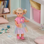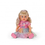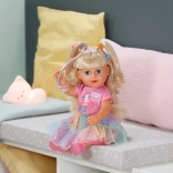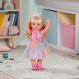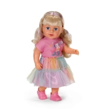 Fedezze fel a BABY born Carla 43 cm babát hosszú, minőségi nejlonszálú hajjal, amely remekül fésülhető. A csomag része 7 hajformázó kiegészítő, a baba mozgatható ízületekkel rendelkezik, magától megáll, és masszív teste révén fürdethető a kádban. A stílust aranyos póló, szivárványos tüllszoknya és rózsaszín cipők egészítik ki – tökéletes a kreatív játékhoz és hajstylinghoz.