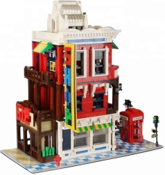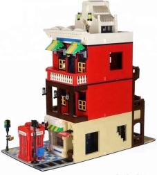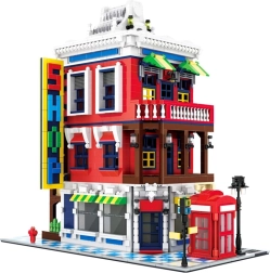 A modell tele van ikonikus kiegészítőkkel: piros telefonfülke – Nagy-Britannia szimbóluma, utcajelző tábla a jelenet realisztikusságáért, díszes függőcégér és igényesen kidolgozott tető, amely kiemeli az épület építészeti stílusát.