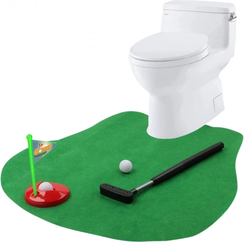 WC-golf: szórakoztató készlet 80×68 cm-es szőnyeggel, putterrel, 2 labdával, zászlós lyukkal és ajtóakasztóval. Gyors összeszerelés, remek vicces ajándék.