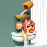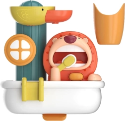 Ez az okos fürdőjáték pozitív viszonyt alakít ki a higiéniához, fejleszti a finommotorikát és a kéz–szem koordinációt. Elég szappant tölteni a tartályba és megnyomni a kézi gombot – az oroszlán fogkeféje sok habot készít, ami mosolyt csal minden baba és totyogó arcára. A kacsa fejébe töltött víz mozgásba hozza a forgókákat és elindítja a vízicsúszdát.