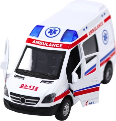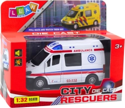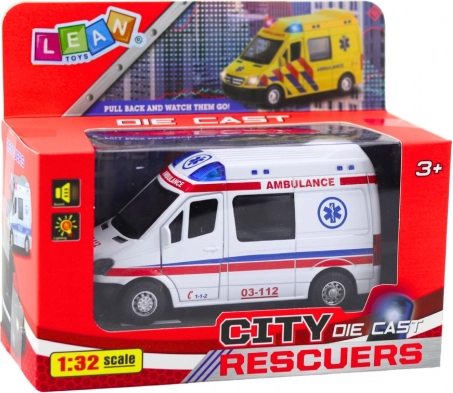 - 1:32 méretarányú mentőautó visszahúzós meghajtással, 3× AG13 elem, gyári csomagolás